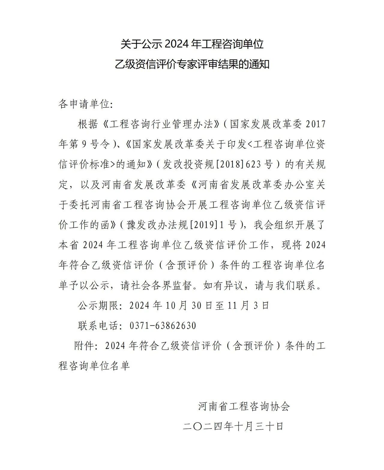 近期,河南省工程咨詢協(xié)會(huì)發(fā)布了《關(guān)于公示2024年工程咨詢單位乙級(jí)資信評(píng)價(jià)結(jié)果的通知》,公司成功取得了“工程咨詢單位乙級(jí)資信證書(shū)”。
