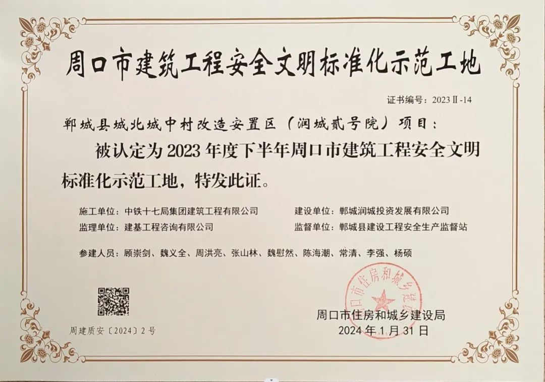 “鄲城縣城北城中村改造安置區(qū)(潤(rùn)城貳號(hào)院)項(xiàng)目”被評(píng)為“2023年度下半年周口市建筑工程安全文明標(biāo)準(zhǔn)化示范工地”,