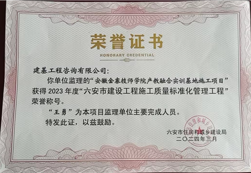“安徽金寨技師學(xué)院產(chǎn)教融合實(shí)訓(xùn)基地施工項(xiàng)目”被評(píng)為“2023年度六安市建設(shè)工程施工質(zhì)量標(biāo)準(zhǔn)化管理工程榮譽(yù)稱(chēng)號(hào)”。