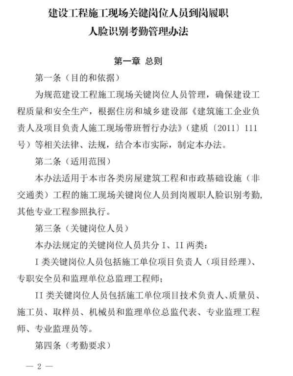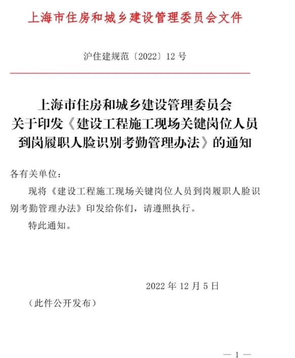 近日,上海市住建委印發(fā)《建設(shè)工程施工現(xiàn)場關(guān)鍵崗位人員到崗履職人臉識別考勤管理辦法》,自發(fā)布之日起施行。