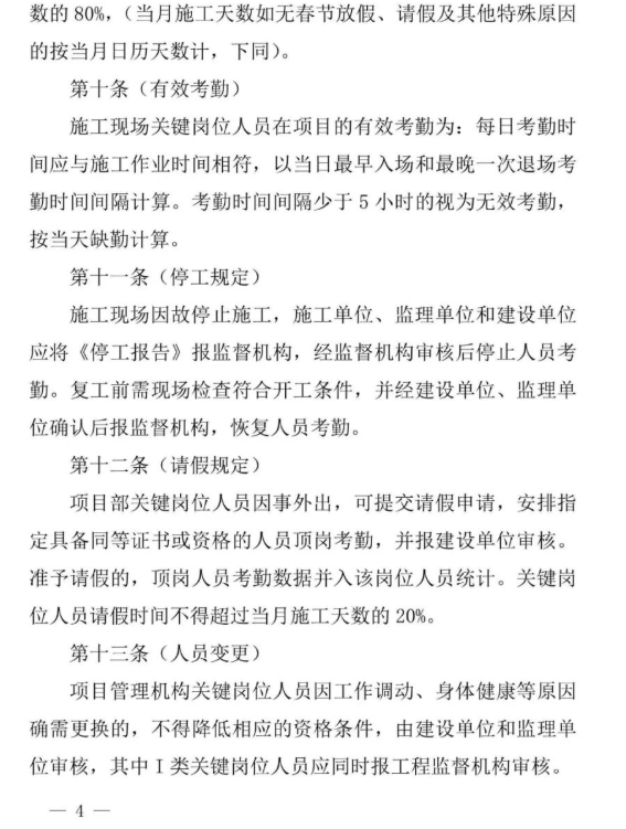 施工現(xiàn)場關(guān)鍵崗位人員考勤月到崗率不得低于當(dāng)月施工天數(shù)的80%,(當(dāng)月施工天數(shù)如無春節(jié)放假、請假及其他特殊原因的按當(dāng)月日歷天數(shù)計(jì),下同)。