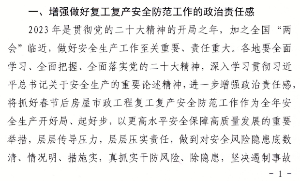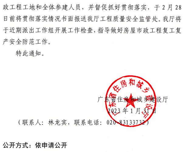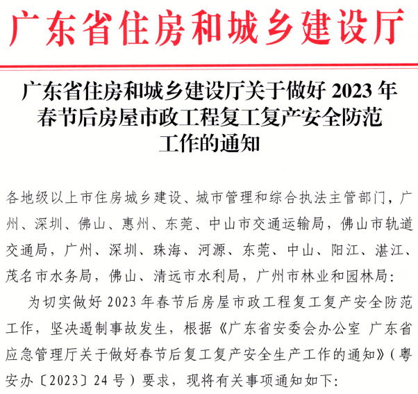 近日,廣東省住建廳發(fā)布《廣東住建廳關于做好2023年春節(jié)后房屋市政工程復工復產(chǎn)安全防范工作的通知》。