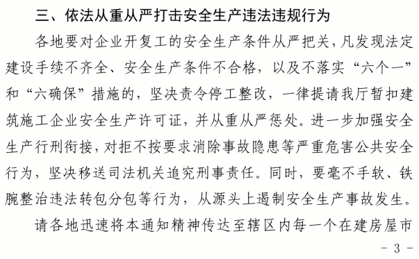 各地要對企業(yè)開復工的安全生產(chǎn)條件從嚴把關,凡發(fā)現(xiàn)法定建設手續(xù)不齊全、安全生產(chǎn)條件不合格,以及不落實“六個一”和“六確保”措施的,堅決責令停工整改,一律提請我廳暫扣建筑施工企業(yè)安全生產(chǎn)許可證,并從重從嚴懲處。