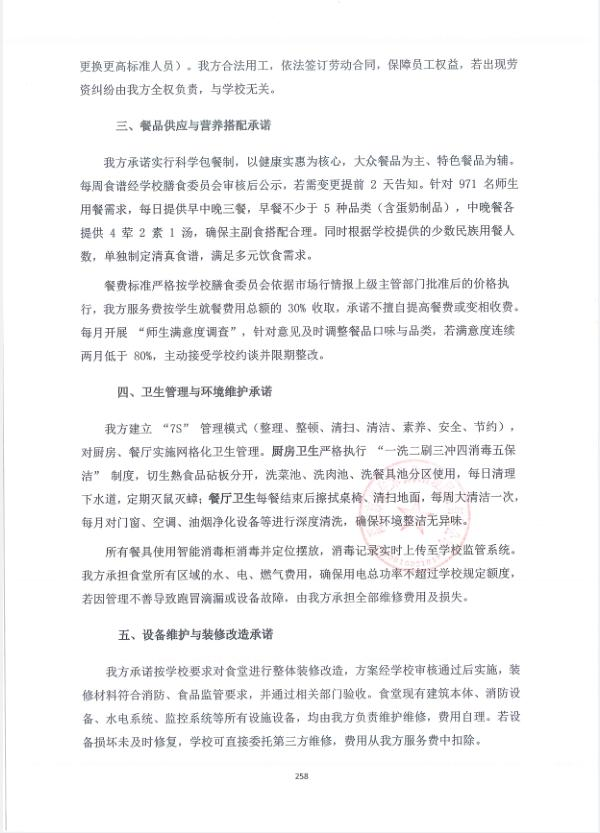 4 | 河南盛鮮禾餐飲管理有限公司 | 服務(wù)期1年(期滿考核,合格可以續(xù)約,最多可續(xù)約四次),每年對(duì)服務(wù)商考核,考核合格后,續(xù)約合同;考核不合格,自動(dòng)終止合同。如合同執(zhí)行期間與國(guó)家、省市政策或規(guī)定不符,按國(guó)家、省市相應(yīng)政策執(zhí)行 | 密封完好 |