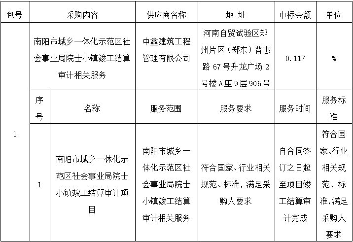 南陽市城鄉(xiāng)一體化示范區(qū)社會事業(yè)局院士小鎮(zhèn)竣工結(jié)算審計項目成交公告