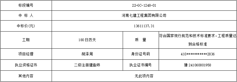 經(jīng)招標人確定,現(xiàn)將該項目鄭州市管城回族區(qū)建武路(天福路-潯江西路)道路工程項目(標段編號:22-GC-1248-01)的中標結果公告如下: