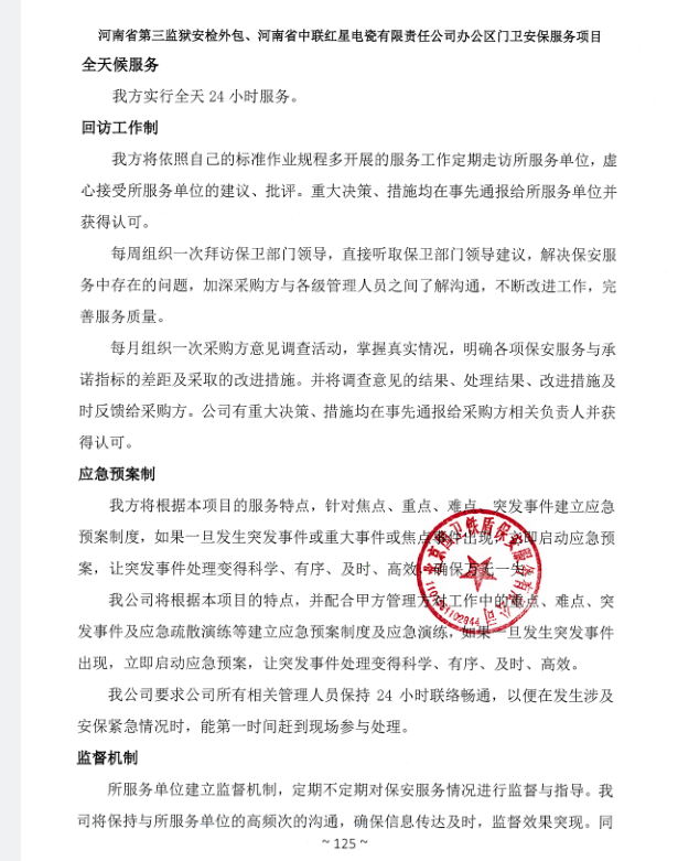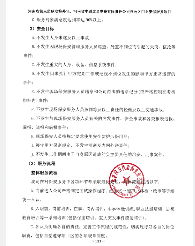 一、項目名稱:河南省第三監(jiān)獄安檢外包、河南省中聯(lián)紅星電瓷有限責(zé)任公司辦公區(qū)門衛(wèi)安保服務(wù)項目