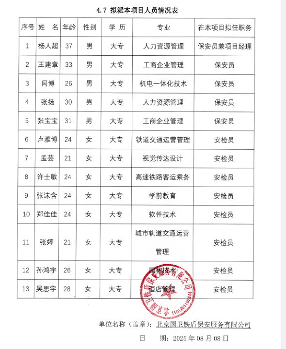 本次采購內(nèi)容為聘請不少于13名安檢安保人員(8名女性安檢人員及5名男性安保人員)在采購人指定崗位提供安檢安保服務(wù)(詳見競爭性磋商文件第二章項目需求) | 北京國衛(wèi)鐵盾保安服務(wù)有限公司 | 423000.00 |